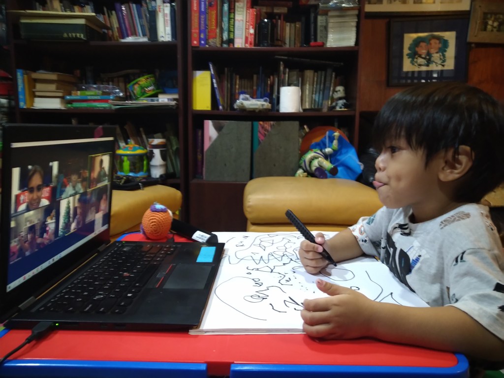 Of course the quarantine changed everyone’s plans. The first week, we tried teaching Lucas ourselves by reading to him, using flashcards and creative activities. It’s a good thing his Loola was also staying with us and she helped read some books with The Child.