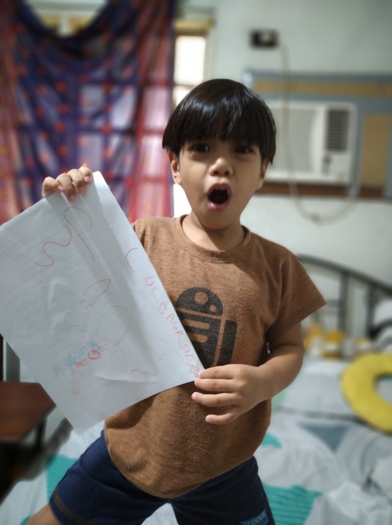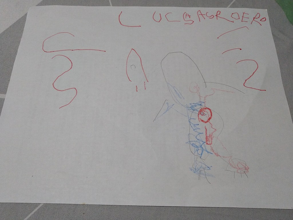 L: This is my drawing, I made my body here and the head here. Then I used red and blue lines.