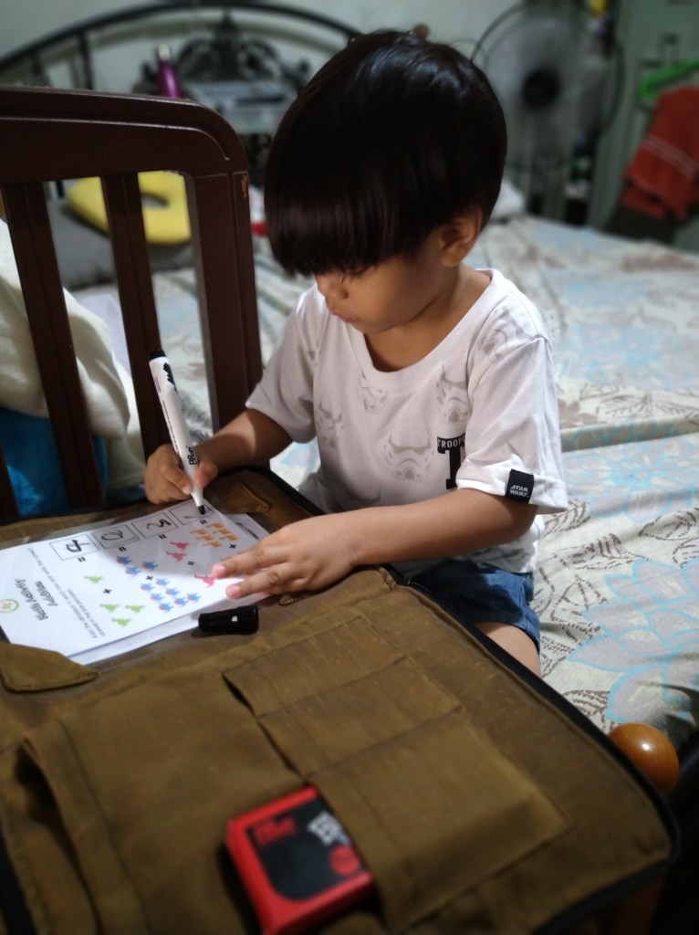 A month ago, his teacher sent them a bag with a whiteboard marker, eraser and a whole bunch of laminated activity sheets that they would do in class or as homework.