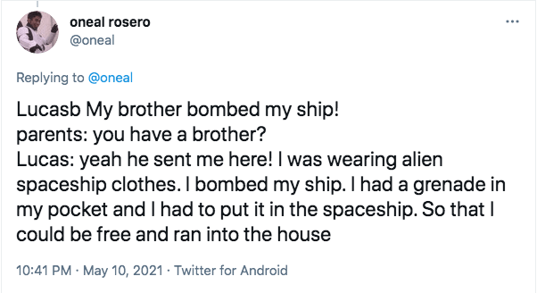 Lucas: yeah he sent me here! I was wearing alien spaceship clothes. I bombed my ship. I had a grenade in my pocket and I had to put it in the spaceship. So that I could be free and ran into the house