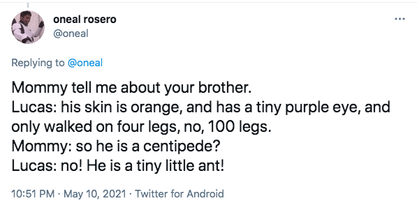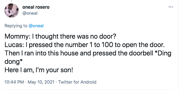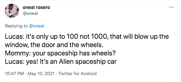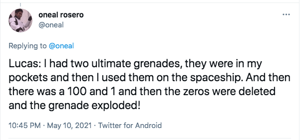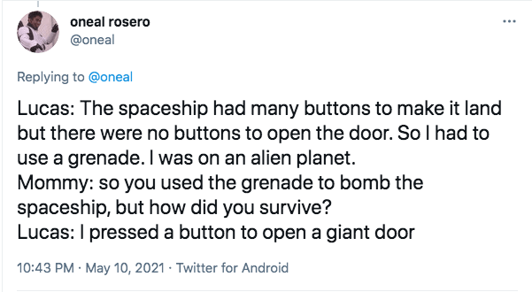 Mommy: so you used the grenade to bomb the spaceship, but how did you survive?