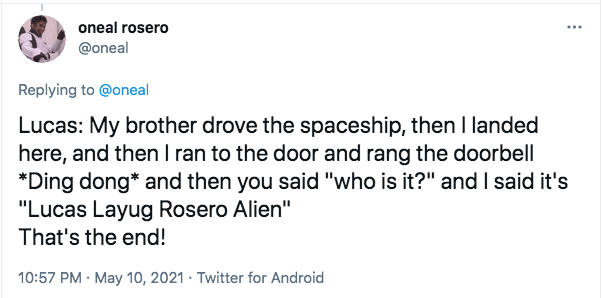 and I said it’s “Lucas Layug Rosero Alien” That’s the end!