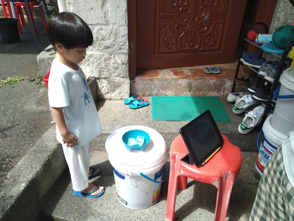 Since the art lesson of the day is to mix red and yellow to make orange and use it to draw a sun, the homework experiment was to see what the heat of the sun can do. So they were tasked to take an ice cube, and put it under the sun and watch what happens to it
