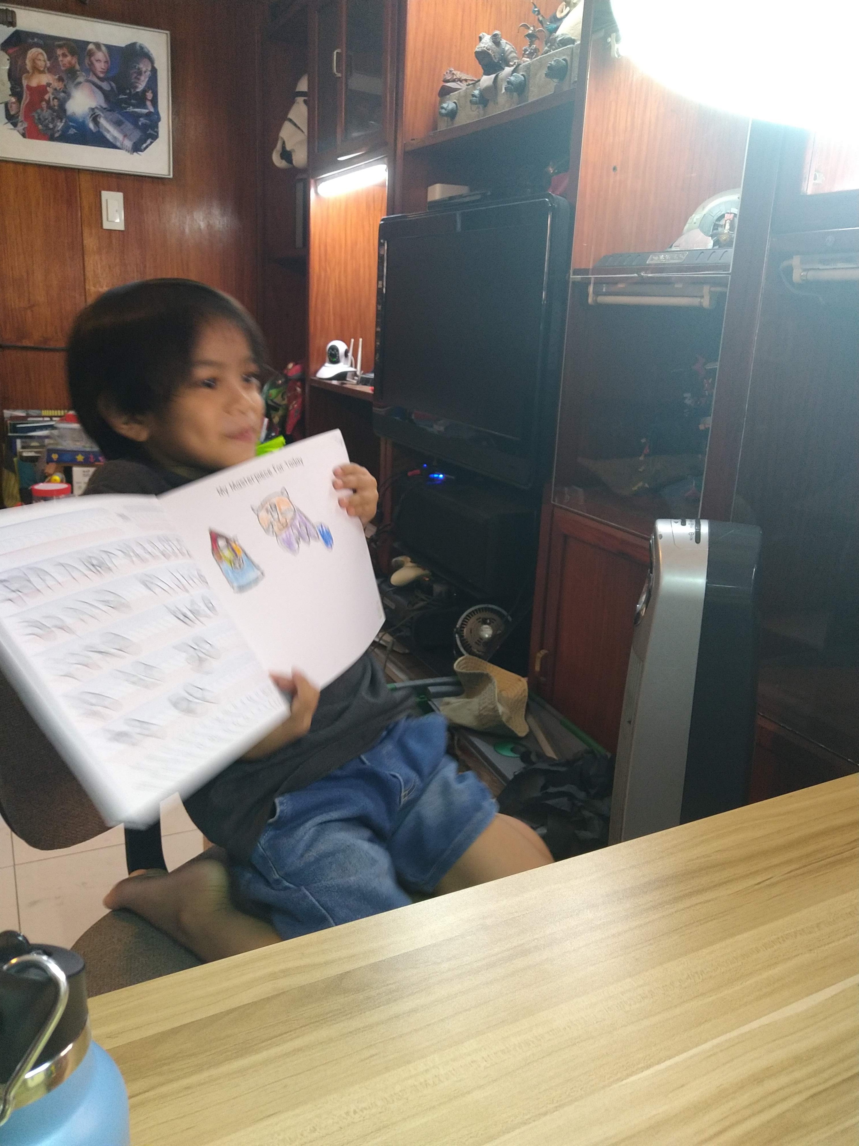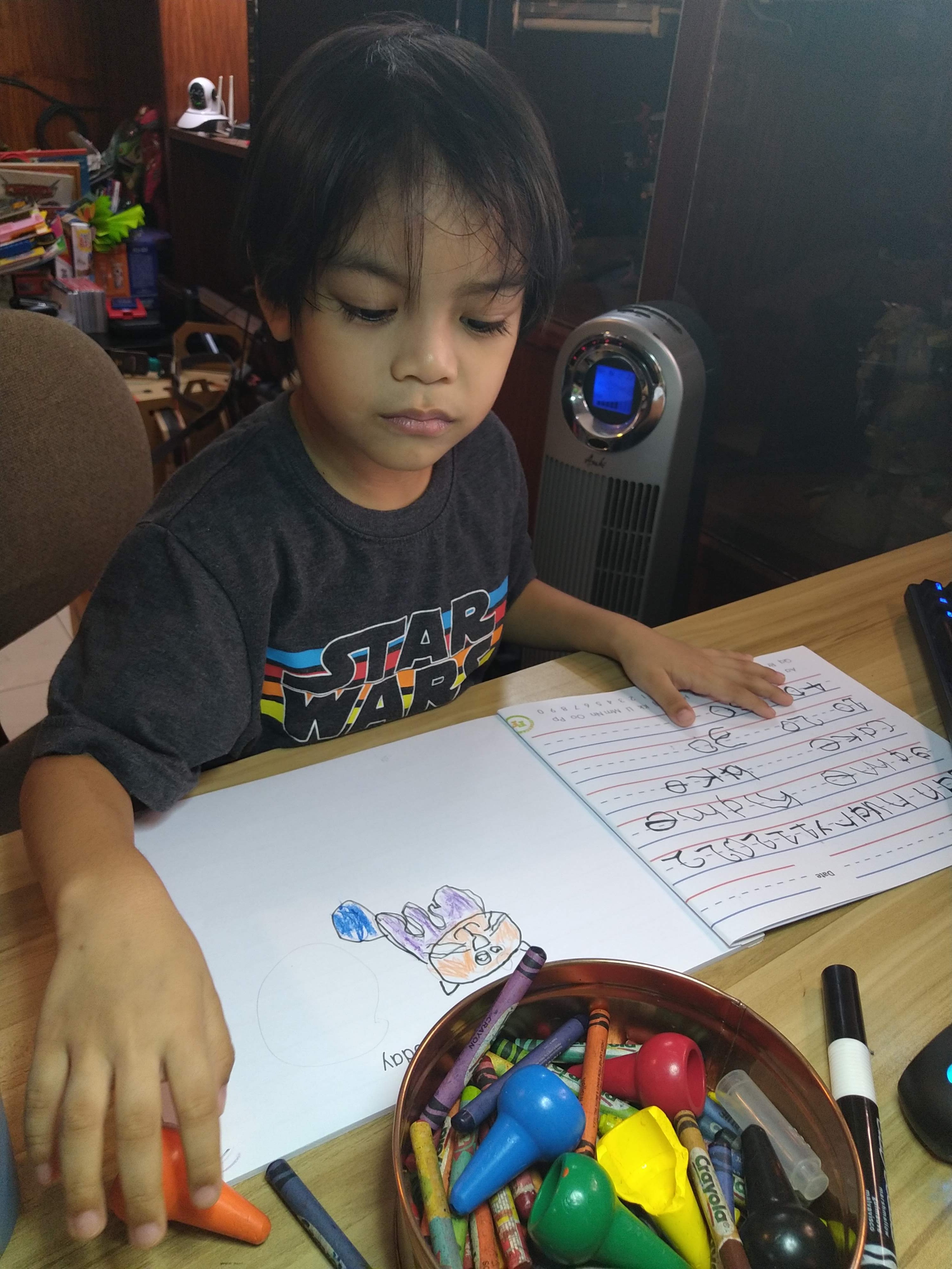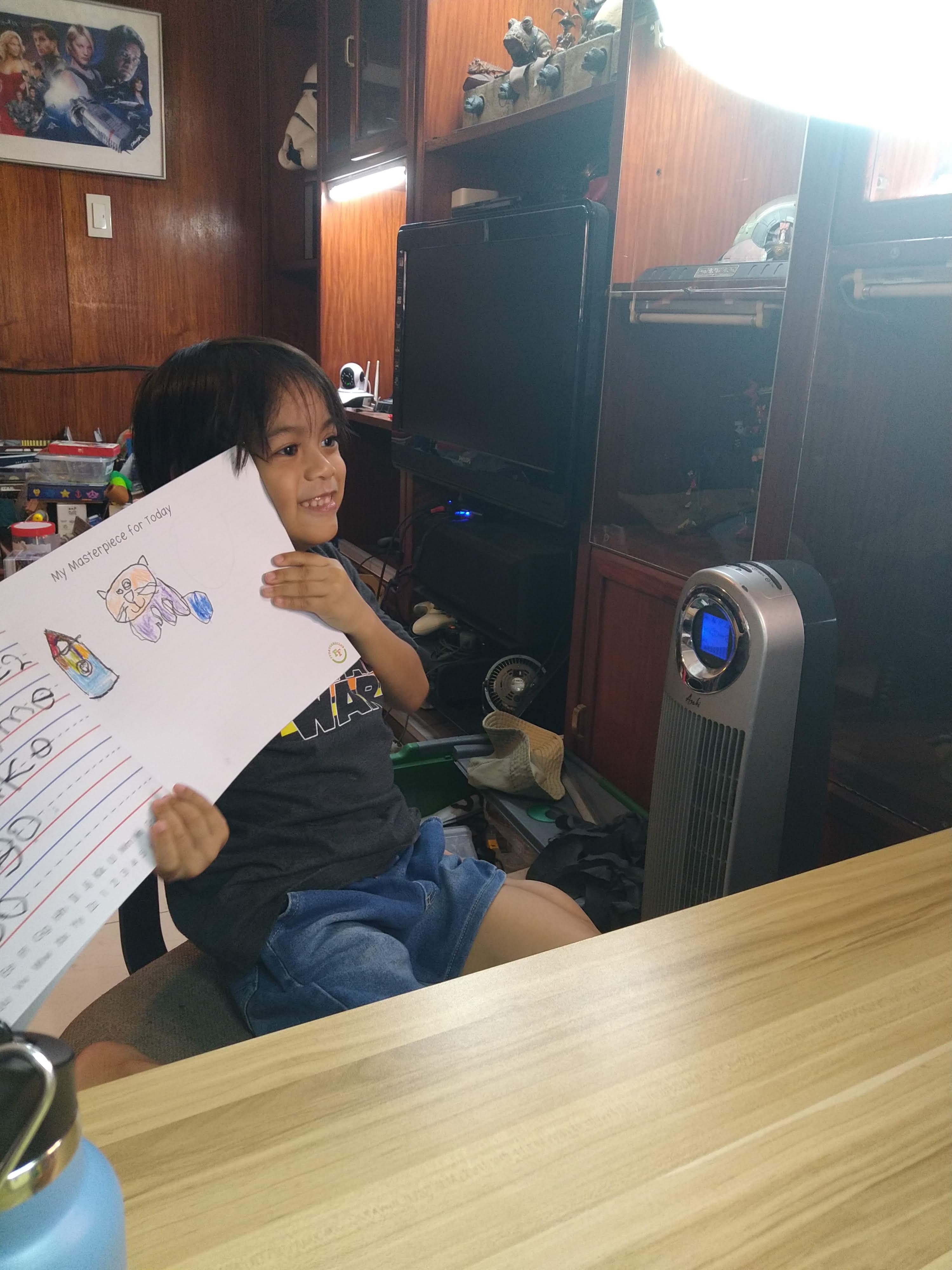 Their lesson today was about cats and when they were drawing, he asked teacher what her favorite colors were and he made sure to color the cat accordingly.